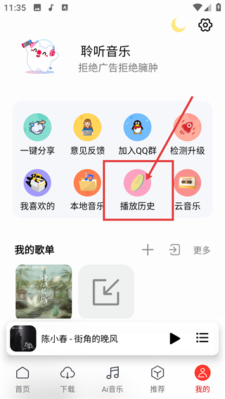 2、进入个人中心页面后,点击【播放历史】选项,即可查看此前播放过的歌曲列表,轻松找回听过的内容。