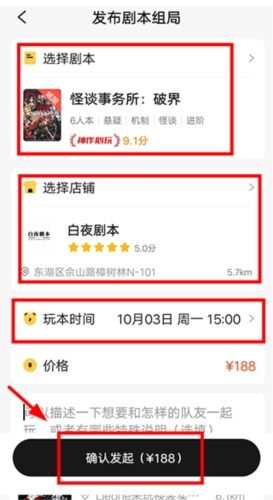 4、选好剧本,店铺,时间后,点击【确认发起】即可。