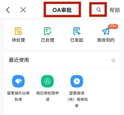 2、进入OA审批界面,请点击右上角搜索“望里镇外出审批单”或“望里镇请(休)假审批单”