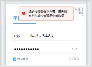 三、登录客户端提示“您的相关数据不完善,请先联系所在单位管理员完善数据”,是什么原因?