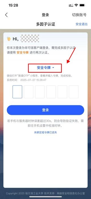 在统一身份认证登录流程中,要是遇到下图所示的二次认证界面,可点击图里红框标注的位置,再依据个人使用习惯,从【安全令牌】、【哈工大验证码】、【短信验证码】、【邮箱验证码】这几种方式里挑选一种来完成二次认证。