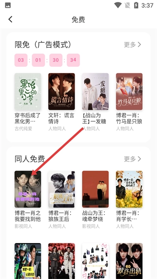 2、在免费板块里,找到【同人免费】区域,点击你感兴趣的作品封面,就能进入作品详情页。