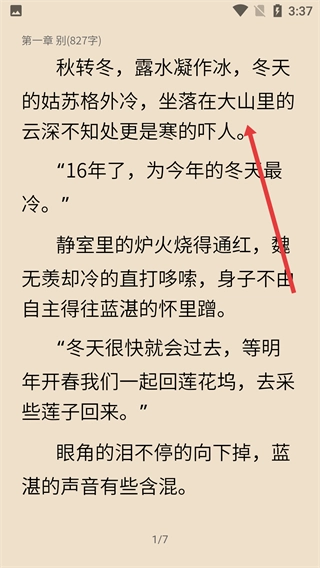 进入阅读界面后,就能浏览章节内容(比如第一章的文字),沉浸式地阅读作品。