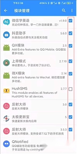 打开模块管理界面,就能看到已安装的模块;勾选模块时,系统会提示该模块所支持的应用版本,而应用版本可在太极主界面查看,若版本不兼容,则无法使用该模块。