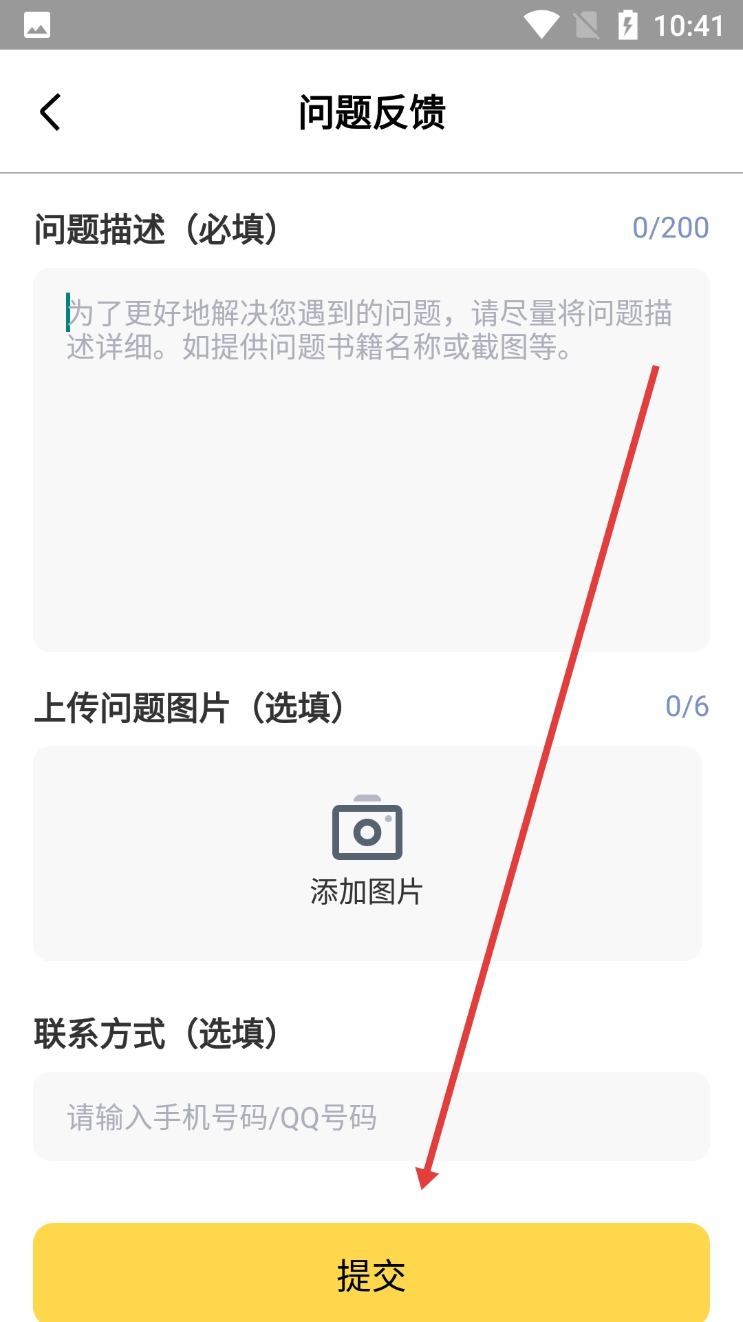 4、进入问题反馈页面后,填写问题描述,还可以根据需要上传图片、留下联系方式,之后点击【提交】按钮,即可完成问题反馈。