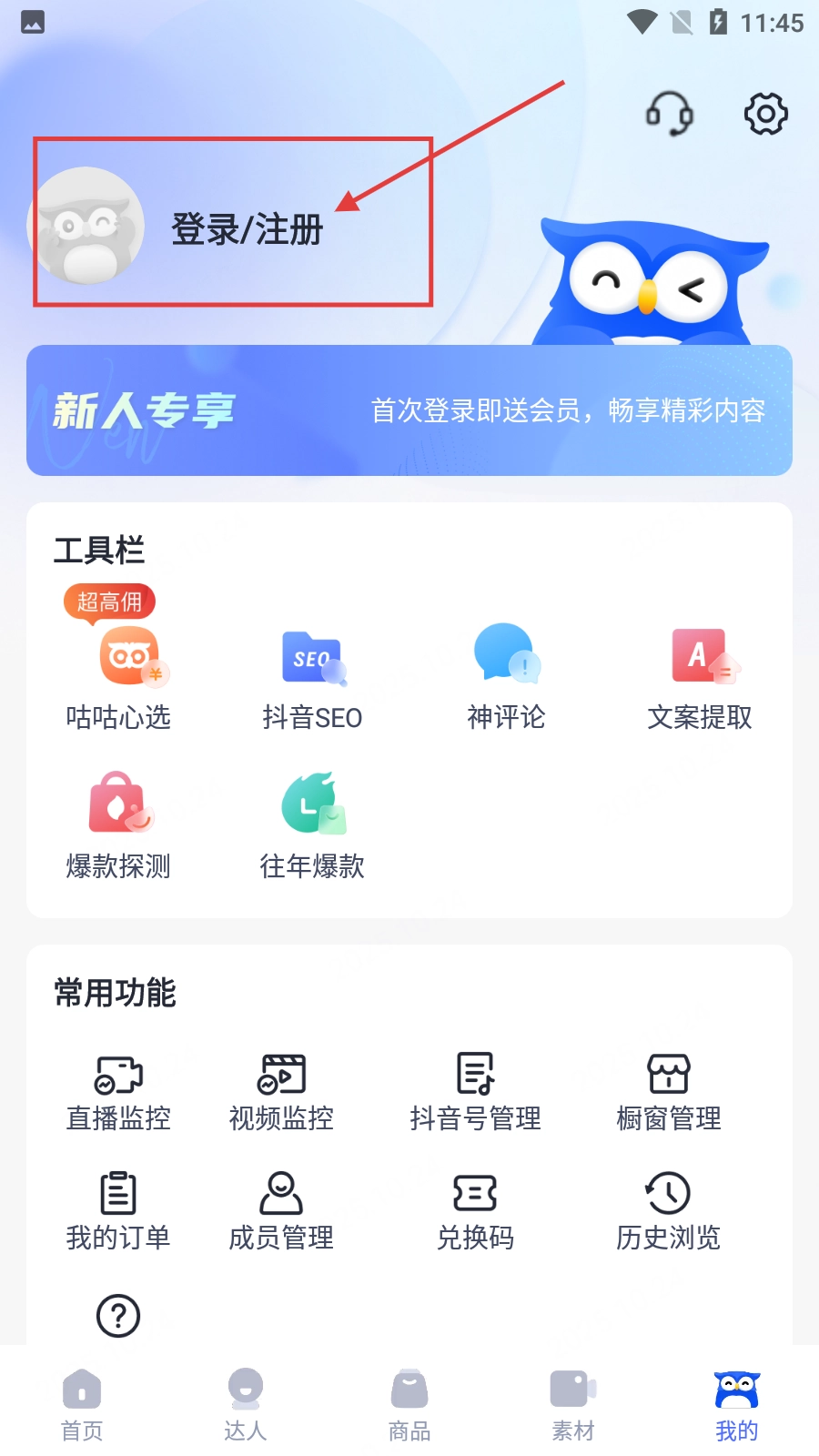 2、在【我的】页面,点击【登录/注册】按钮,即可进入登录与注册的选择界面。