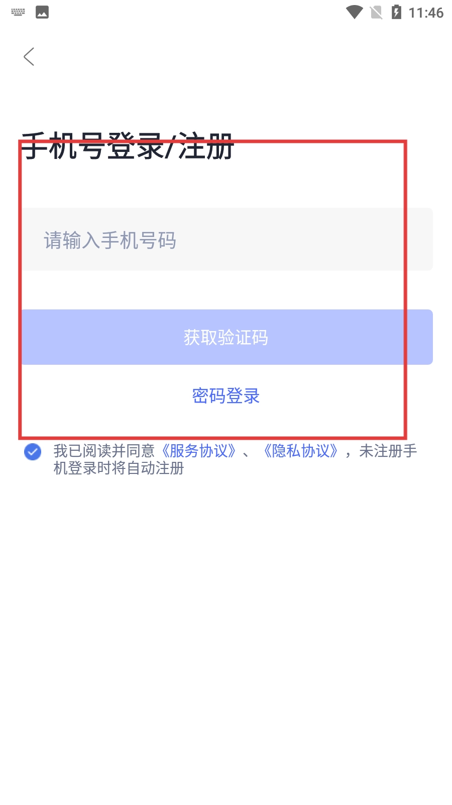 4、进入手机号登录/注册界面后,填写手机号码,点击【获取验证码】按钮,即可完成登录或注册流程。