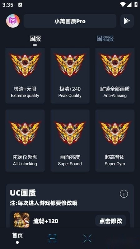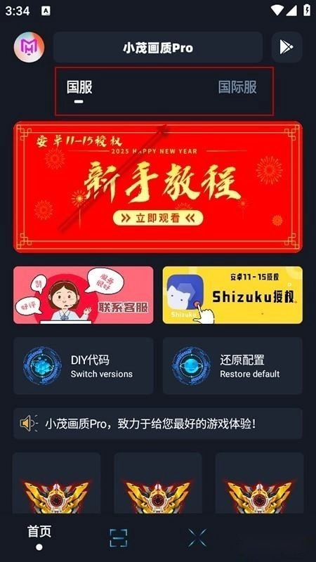 1、软件安装完成后,进入首页时,顶部会显示“国服”或“国际服”的模式选项,你可以依据自己所使用的游戏版本,选择对应的模式。