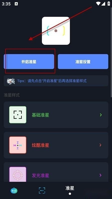 3、点击底部的“准星”图标,先开启准星功能,接着从多种样式里挑选出合适的准星,完成设置后就能在游戏中生效了。