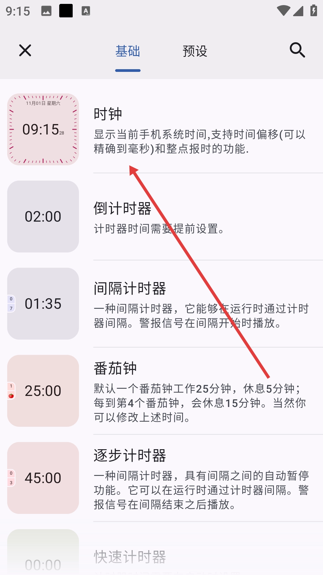 2、进入计时器类型选择页面后,点击选择【时钟】选项。此功能能够展示当前手机的系统时间,并且具备时间偏移设置和整点报时的功能。