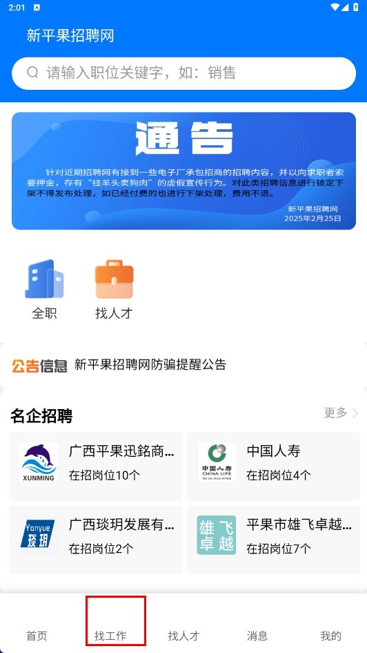 1、点击底部的【找工作】功能按钮,即可进入找工作页面。