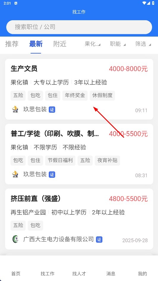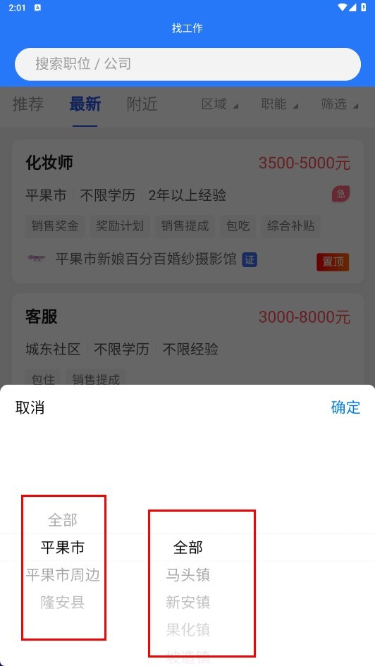 在找工作页面,能够选择区域(例如平果市-果化镇)来筛选职位。
