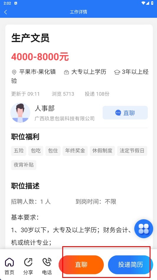 在工作详情页面,你可以点击【直聊】或者【投递简历】功能按钮,来完成求职相关的操作。