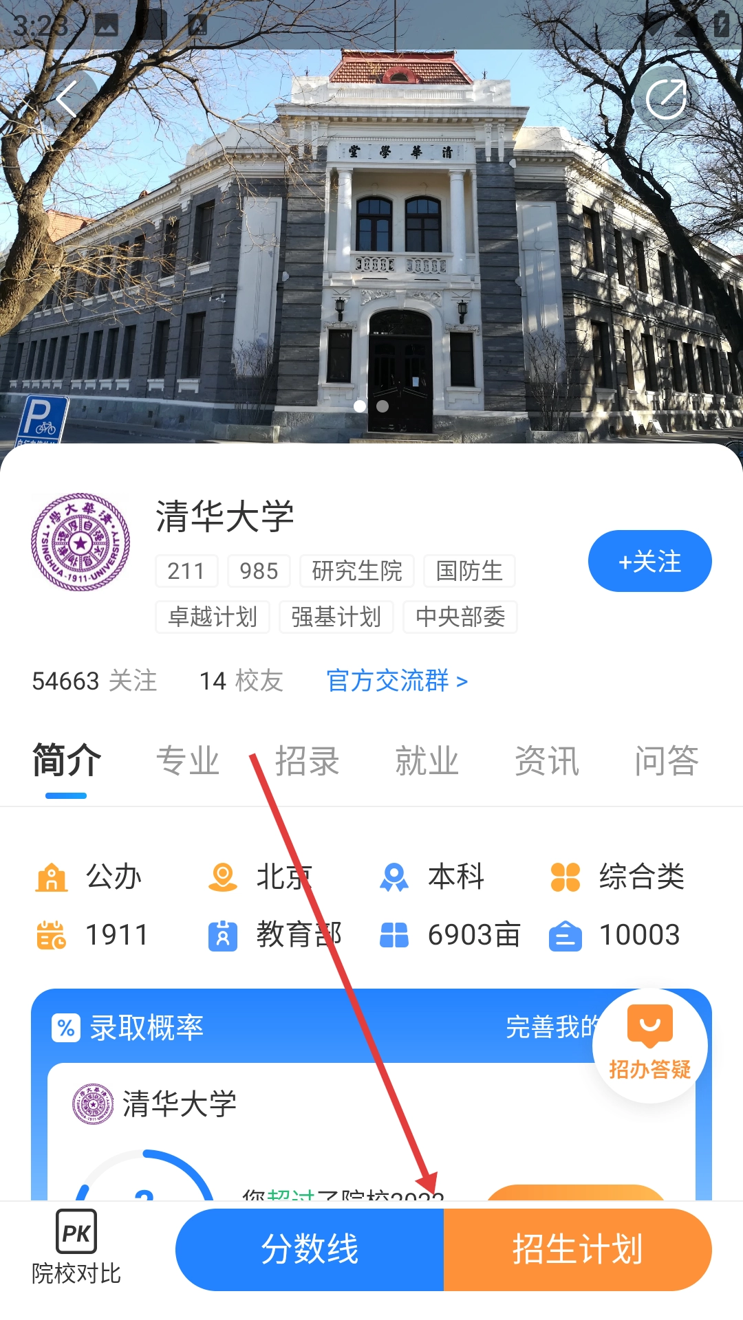 4、在清华大学的详情页面中,你可以点击【分数线】或者【招生计划】这两个选项,从而查看与之对应的相关信息。