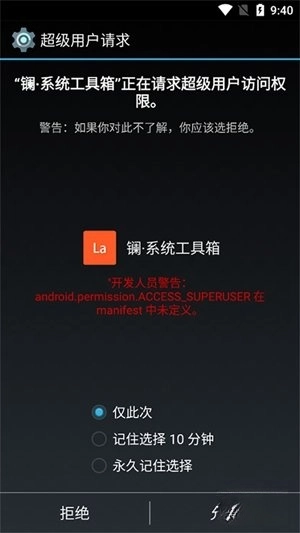 1、首先,用户打开该软件时,会出现如下页面提示。该提示的目的是让用户授权软件获取手机超级用户权限,以保障软件运行更顺畅。一般来说,用户默认选择【仅此次】选项后,点击允许操作即可。