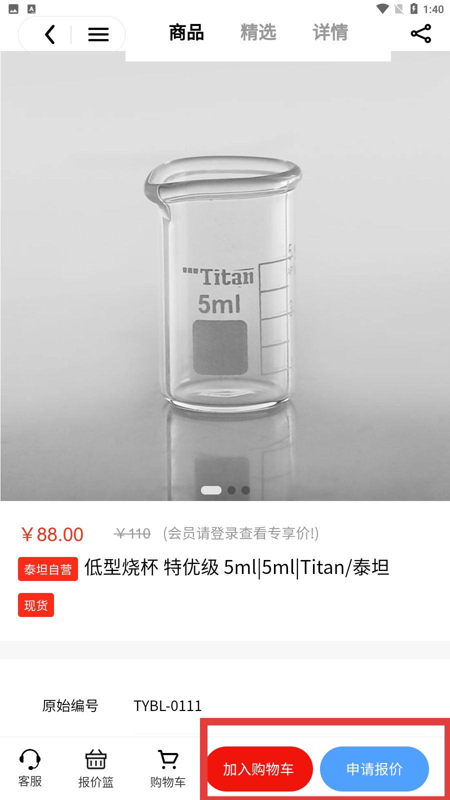 在商品详情页面,您可以点击【加入购物车】按钮或者【申请报价】按钮,以开展后续的相关操作。