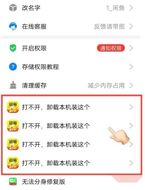 2、点击悟空分身首页的闲鱼图标,进入详情页面后,点击“打不开,卸载本机装这个”选项。
