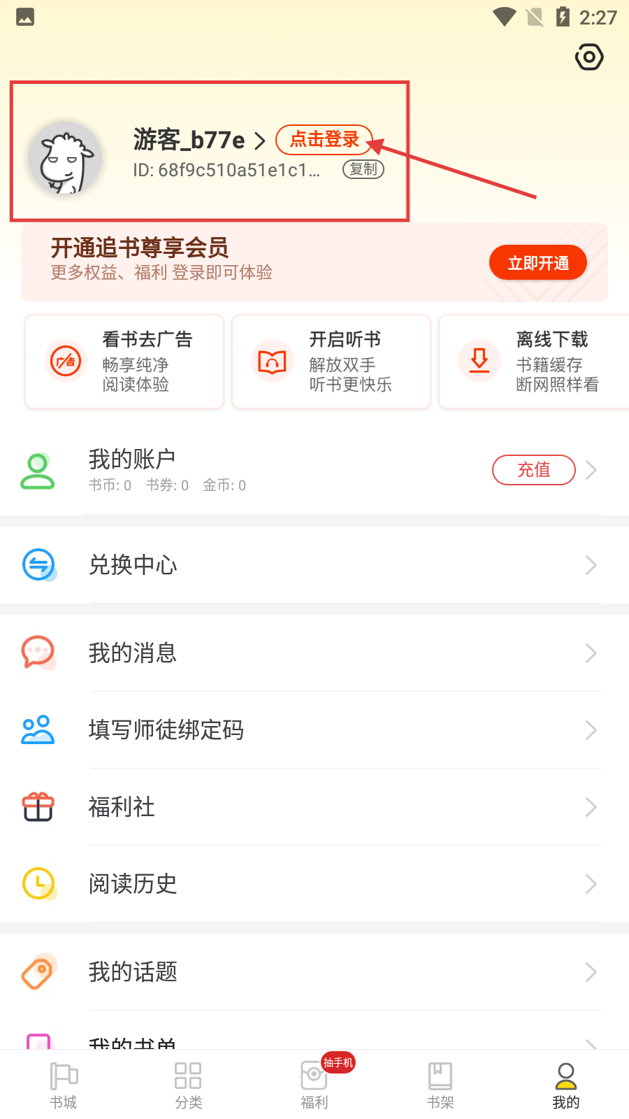 在书城界面中,点击底部的【我的】按钮,即可进入个人页面,在该页面能查看账户、消息、阅读历史等相关功能。