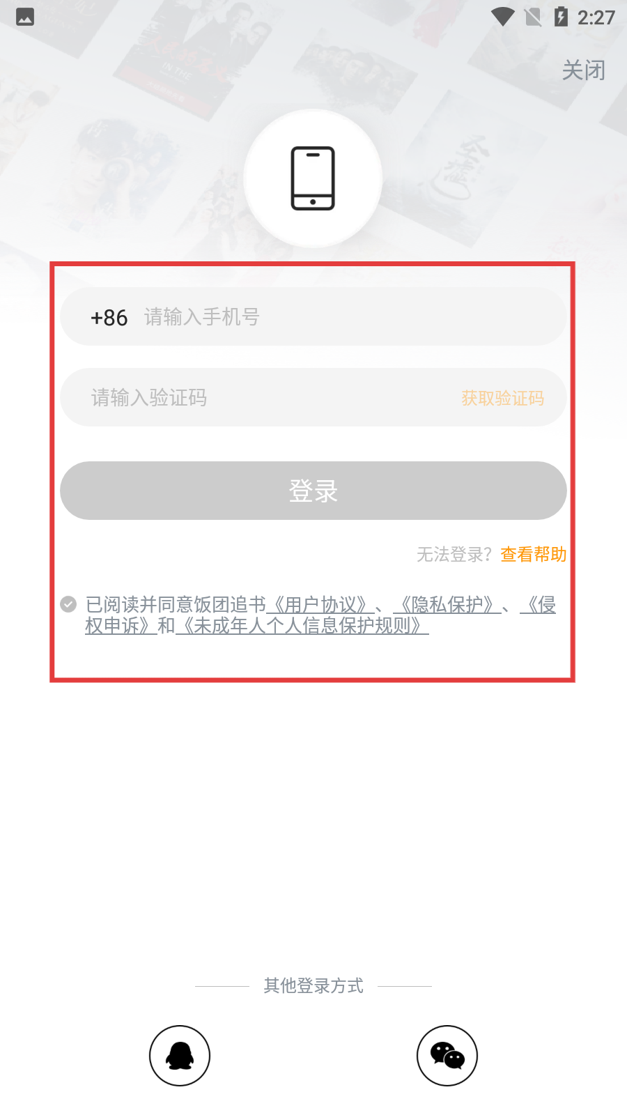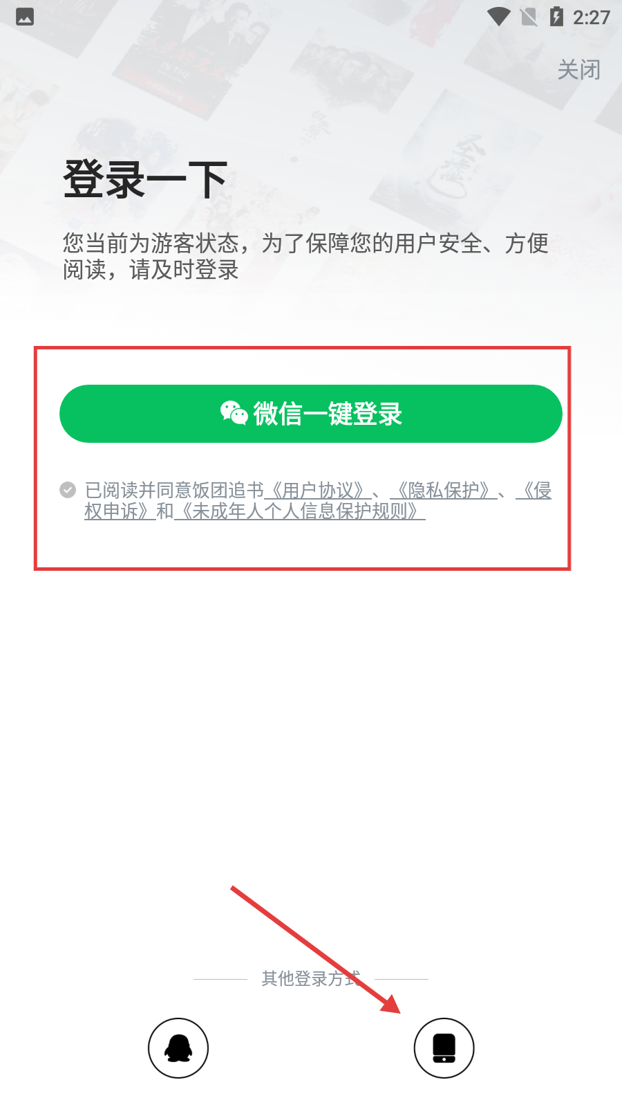 3、在登录选择界面,点击底部的手机图标,即可进入手机验证码登录页面。