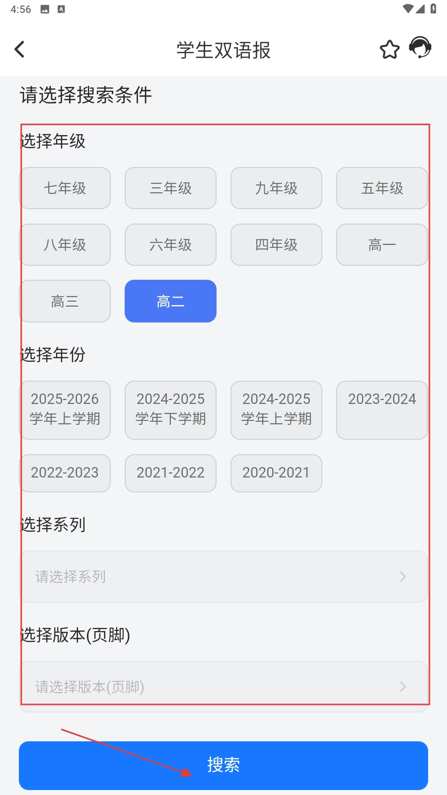 3、选定年级、年份、系列与版本后,点击【搜索按钮】,即可查找对应的资源。