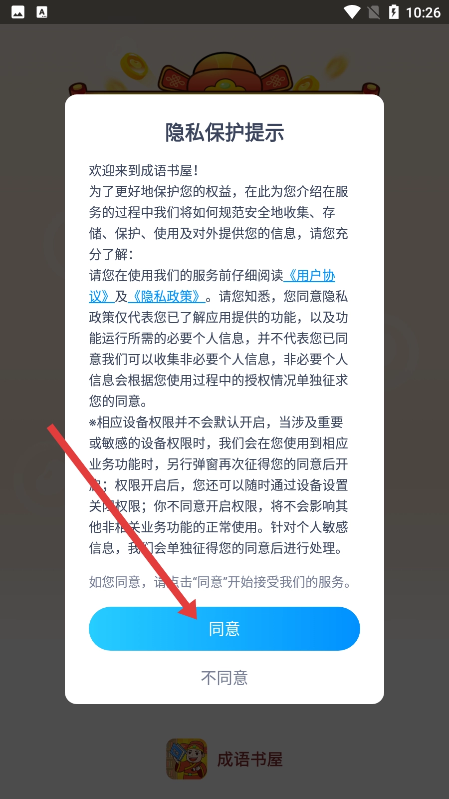 1、第一次使用成语书屋时,要先阅读《用户协议》和《隐私政策》,之后点击【同意】按钮,才能进入应用使用各项功能。