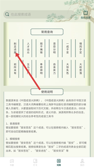 3、进入词典页面后,在常用查询区域找到成语“削足适履”,点击该成语就能进入它的详情页面。