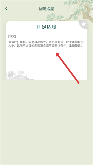 4、进入成语详情页面后,可查看【削足适履】的释义,知晓它指的是不合理地迁就凑合或者生搬硬套的行为。