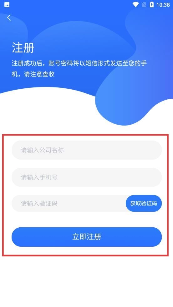 4、进入注册页面后,依次填写公司名称与手机号,获取并输入验证码,随后点击【立即注册】按钮,即可完成注册流程。
