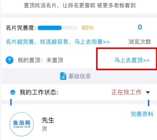 将找活名片设置为置顶状态,能让更多人注意到我们,显著提升找工作的成功率。那么在鱼泡网上如何操作才能把找活名片置顶呢?下面就来详细了解一下具体步骤吧!