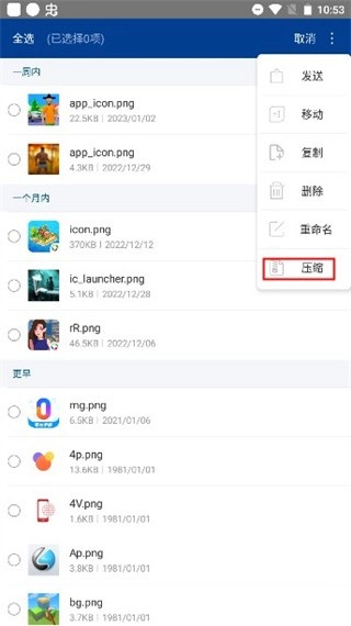 2、选择好后,点击右上角的三个点,选择【压缩】。