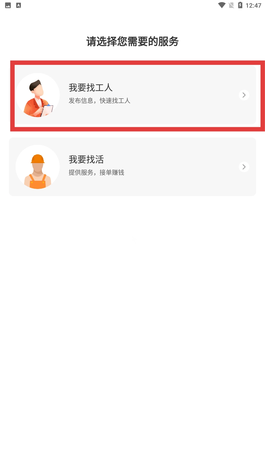 1、点击【我要找工人-服务选项】,进入找工人页面。