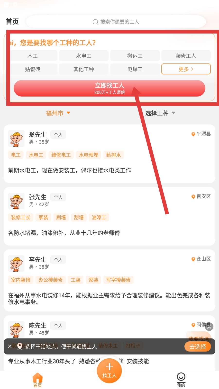 2、进入找工人页面后,挑选具体的工种(像木工、水电工这类),接着点击“立即找工人”按钮。