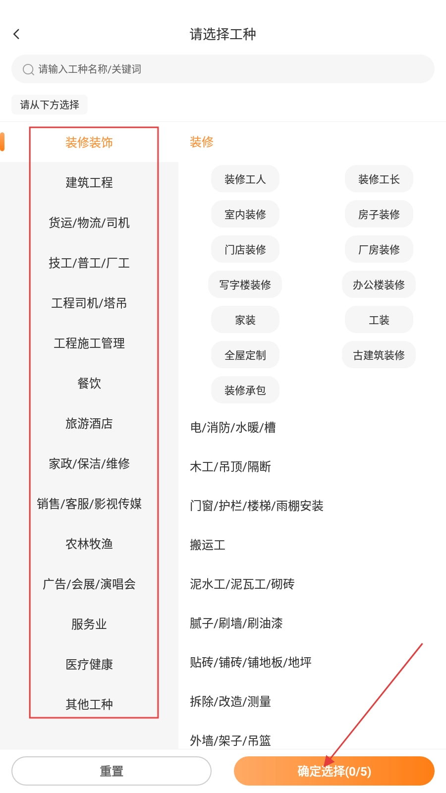 3、进入工种选择页面后,先选定所属行业与具体工种,再点击“确定选择”按钮。