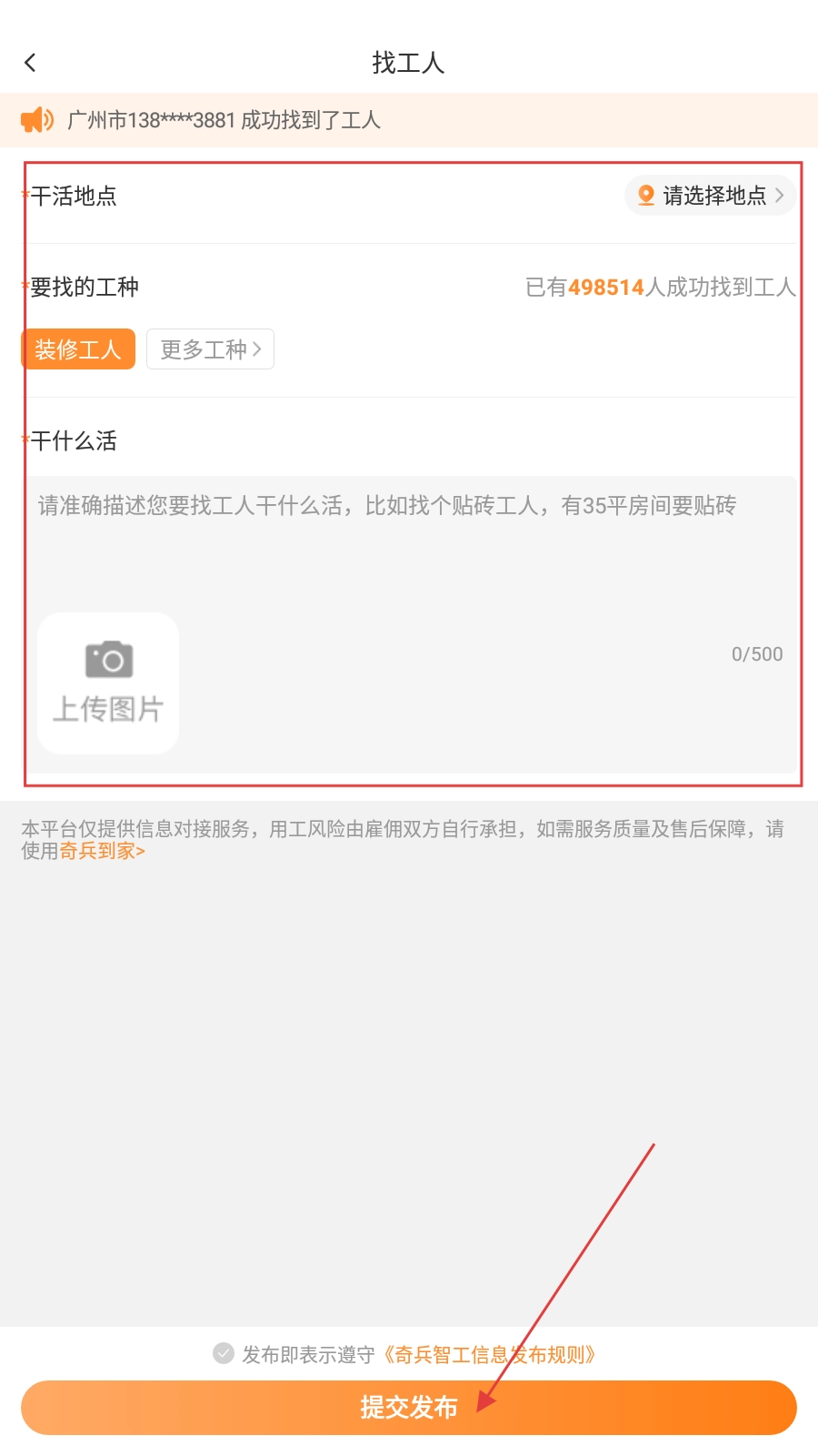 4、进入找工人的发布页面后,依次填写干活地点、工种以及具体的工作内容,完成后点击“提交发布”按钮即可。