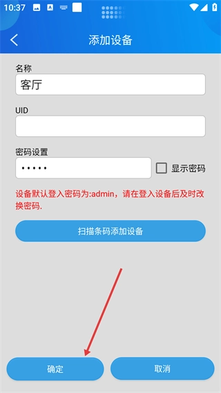 3、在手动添加页面依次填写【名称】【UID】,并设置设备密码(默认密码为admin)。