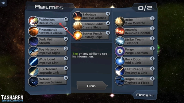 3、进入【Abilities】界面后,能够挑选各类技能(例如【Patriotism】【Sabotage】),点击对应技能就能查看其详细信息,等选够技能数量后,点击【ACCEPT】按钮即可完成确认。