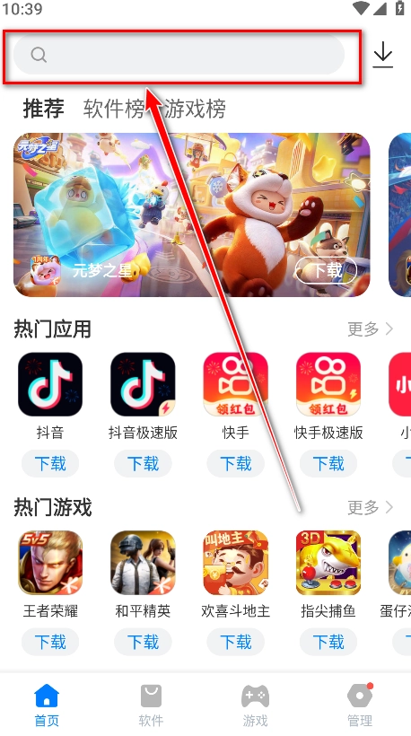 1.打开豌豆应用市场,点击首页上方的搜索框。