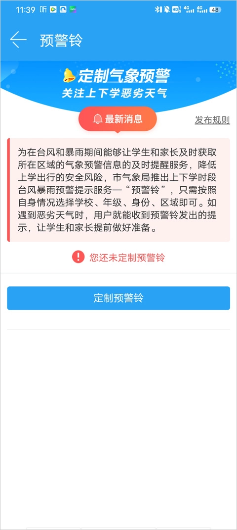 2、为了让学生和家长在台风、暴雨期间能及时收到所在区域气象预警信息的提醒,降低上学出行的安全风险,市气象局推出了上下学时段台风暴雨预警提示服务——“预警铃”,我们点击定制该服务。