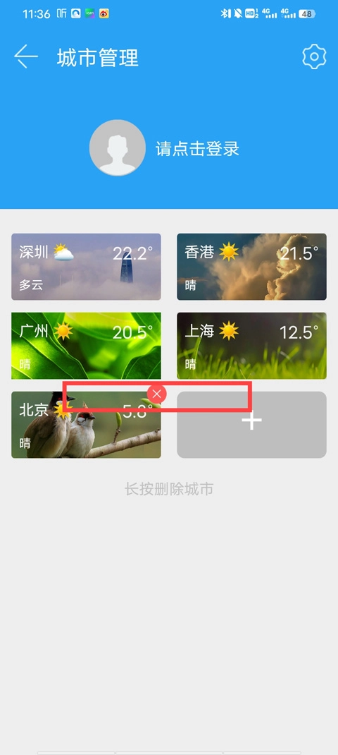 3、长按后会出现x,我们点击x即可删除城市。