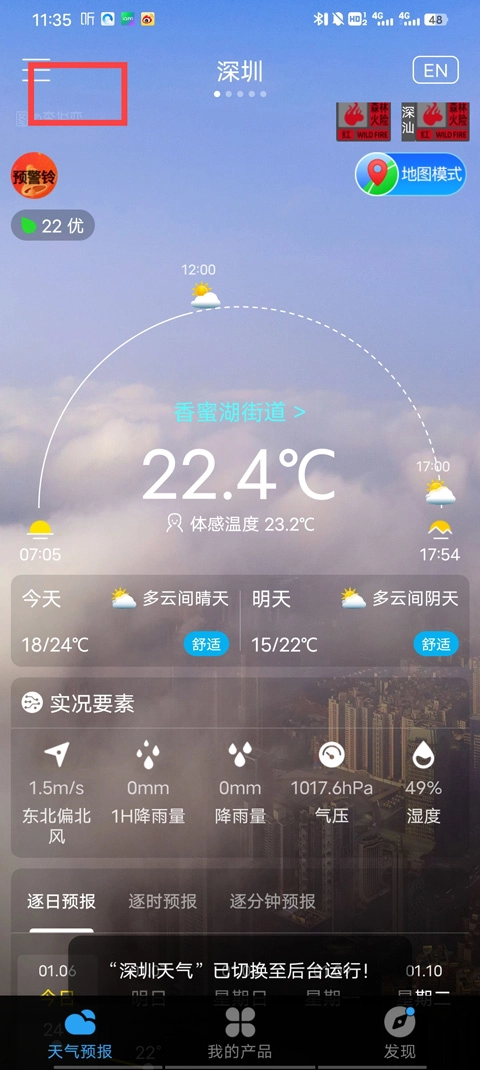 进入软件首页后,能看到详细的天气信息,此时点击左上角的预警铃即可。