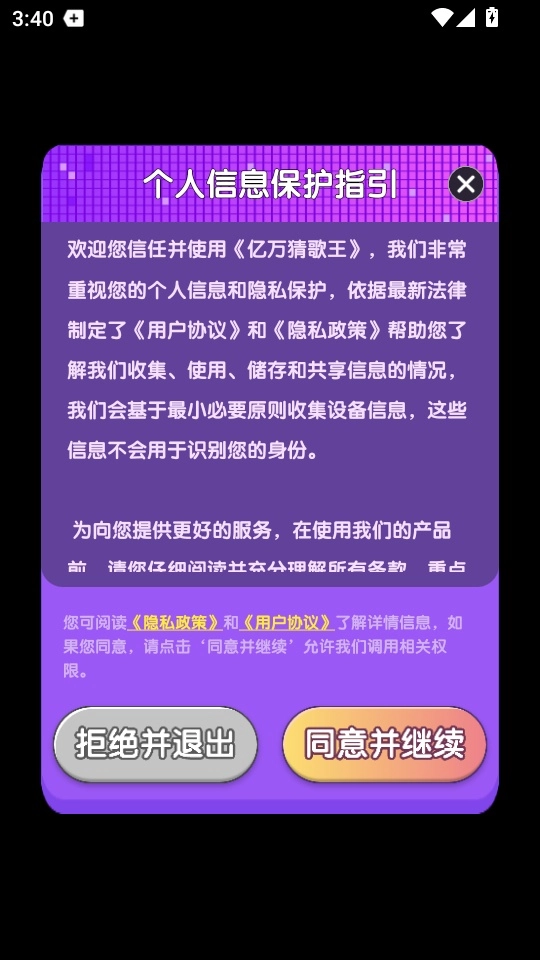 1. 第一步先打开软件,仔细阅读“个人信息保护指引”,之后点击“同意并继续”按钮进入下一步。