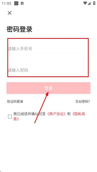 3、进入密码登录页面后,依次填写手机号与密码,勾选相关协议,最后点击登录按钮,即可完成账号登录流程。