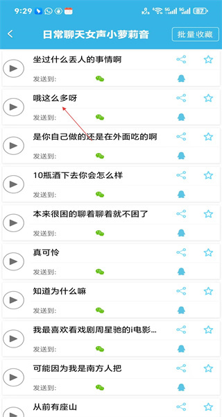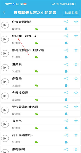 4、切换至日常聊天女声里的小姐姐音分类,能看到多条互动语音选项,点击其中一条语音,即可准备将其用于日常聊天互动。