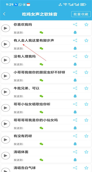 3、切换到吃鸡女声的软妹音分类,浏览其中多条适配吃鸡场景的语音,挑选一条点击,为在游戏内使用做准备。