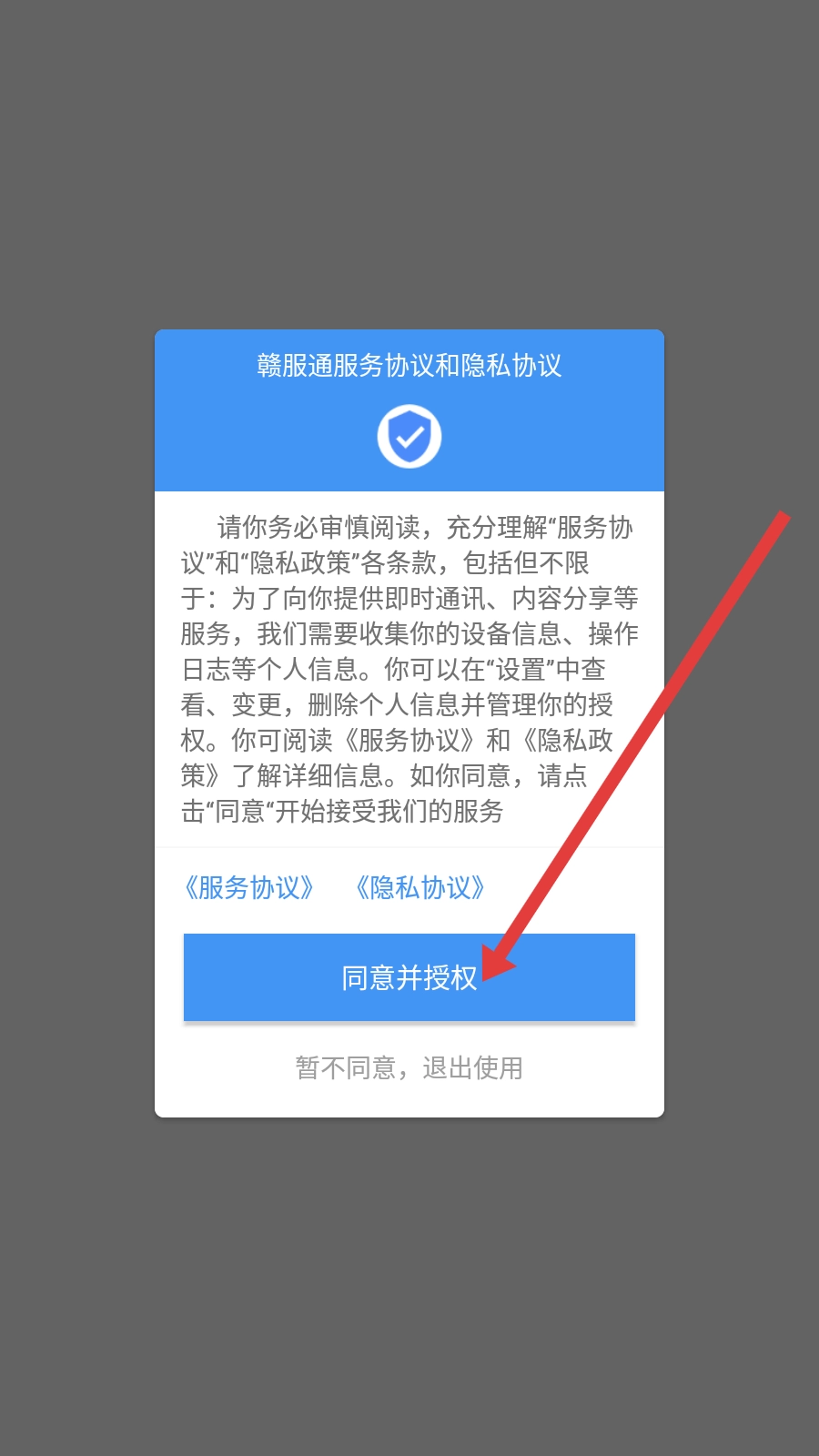 1、当出现赣服通服务协议与隐私协议的弹窗时,点击【同意并授权】按钮,就能开启赣服通的服务使用流程。
