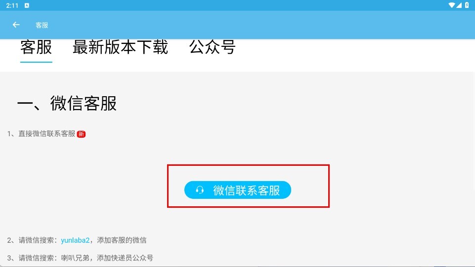 3、在客服页面,点击【微信联系客服】按钮,既能直接通过微信联系客服,也能按照提示搜索并添加客服微信或公众号。