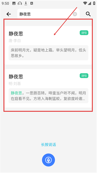 3、在搜索框中输入【静夜思】后,页面会展示不同作者所创作的《静夜思》相关结果,只要选择对应的目标条目,就能查看具体的详情内容了。