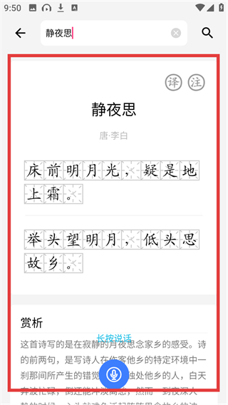 4、点击目标《静夜思》条目,即可进入详情页,查看诗句原文、作者信息以及赏析内容。