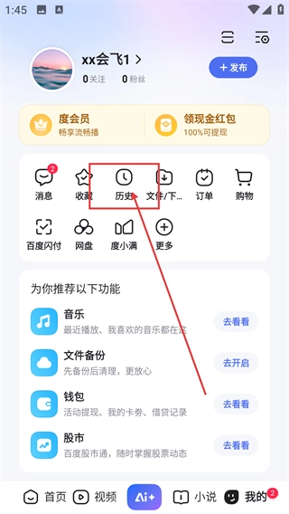 2、进入个人中心后,点击【历史】选项即可查看浏览记录,这里会展示之前访问过的内容条目。