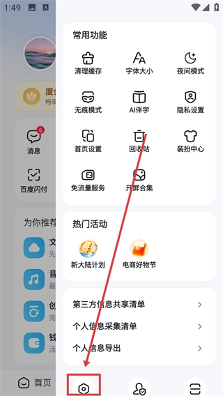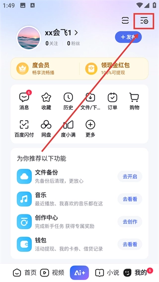 1、进入百度的“我的”页面后,点击右上角的功能菜单图标,即可展开功能列表,从中找到设置相关的入口。
